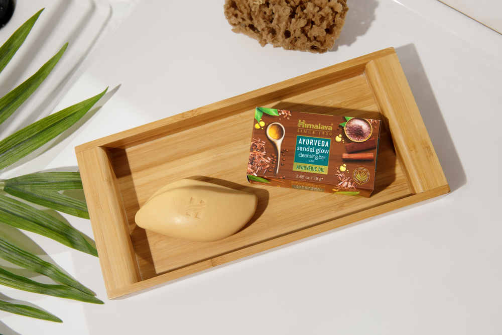 Himalaya Ayurveda Sandal Glow Cleansing Bar is formulated with Chandanadi Ropana Taila, a traditional Ayurvedic oil infused with sandalwood, known for its lasting aroma and skin softening properties.