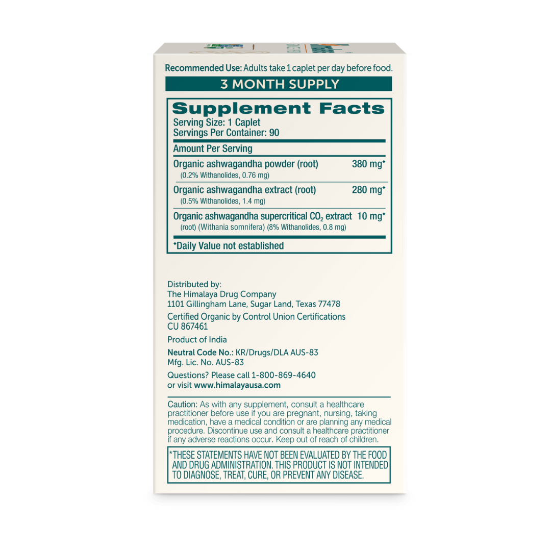 Himalaya’s Organic Ashwagandha uses a blend of clinically-studied ashwagandha root powder and ashwagandha root extract. Different parts of the plant have different amounts and types of compounds. To get a full-spectrum and holistic profile of the plant chemistry, we use different parts of the plants to get the right blend of compounds in the most potent form so that you don’t have to take too many pills.
