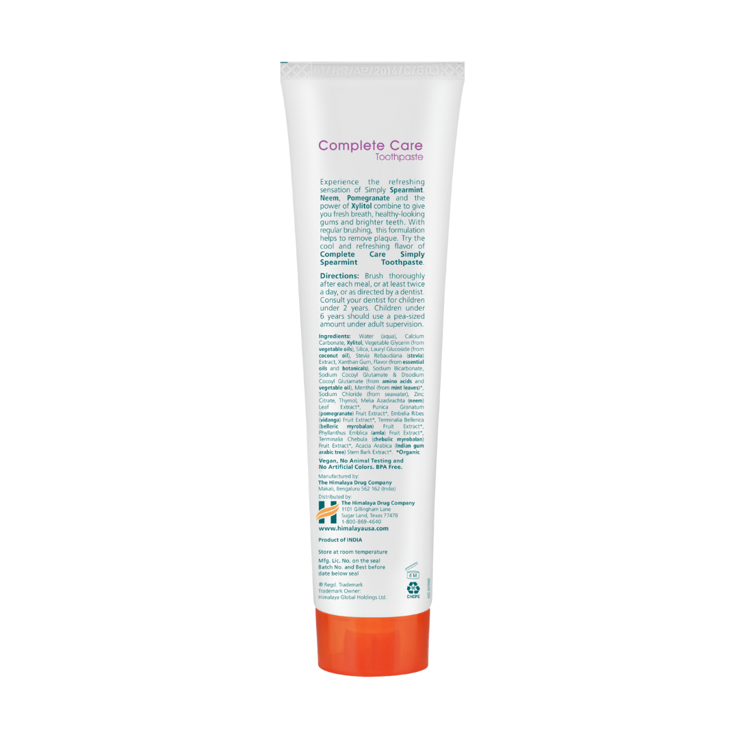 Himalaya uses gentle ingredients without all the extras like Fluoride, Triclosan, SLS or gluten, and it still tastes and foams wonderfully. Our Complete Care Simply Spearmint Toothpaste is delicate and refreshing. It’s designed to give you long-lasting fresh breath and it promotes a brighter smile.